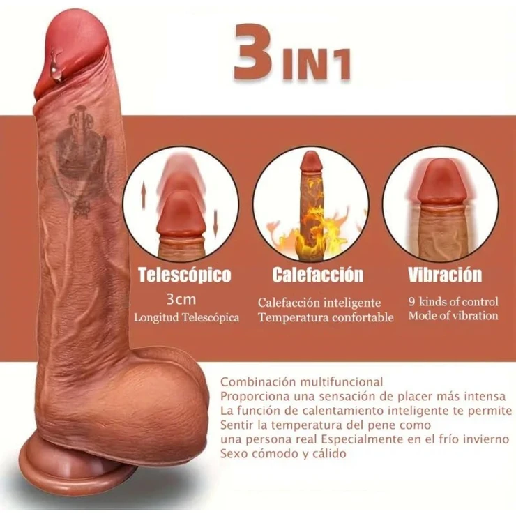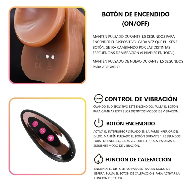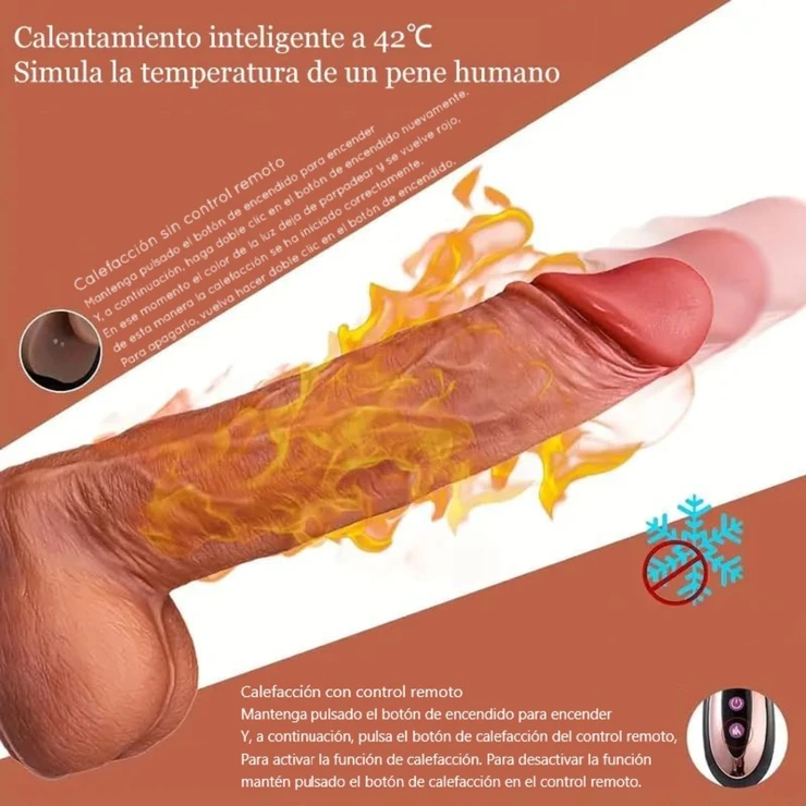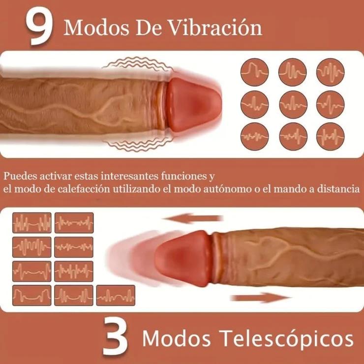 Este innovador juguete incorpora 9 modos de vibración y 3 modos de empuje automático, creando un movimiento rítmico que simula la penetración de forma realista. Además, su función de calentamiento inteligente eleva la temperatura del dispositivo para imitar el calor corporal, intensificando la experiencia.
